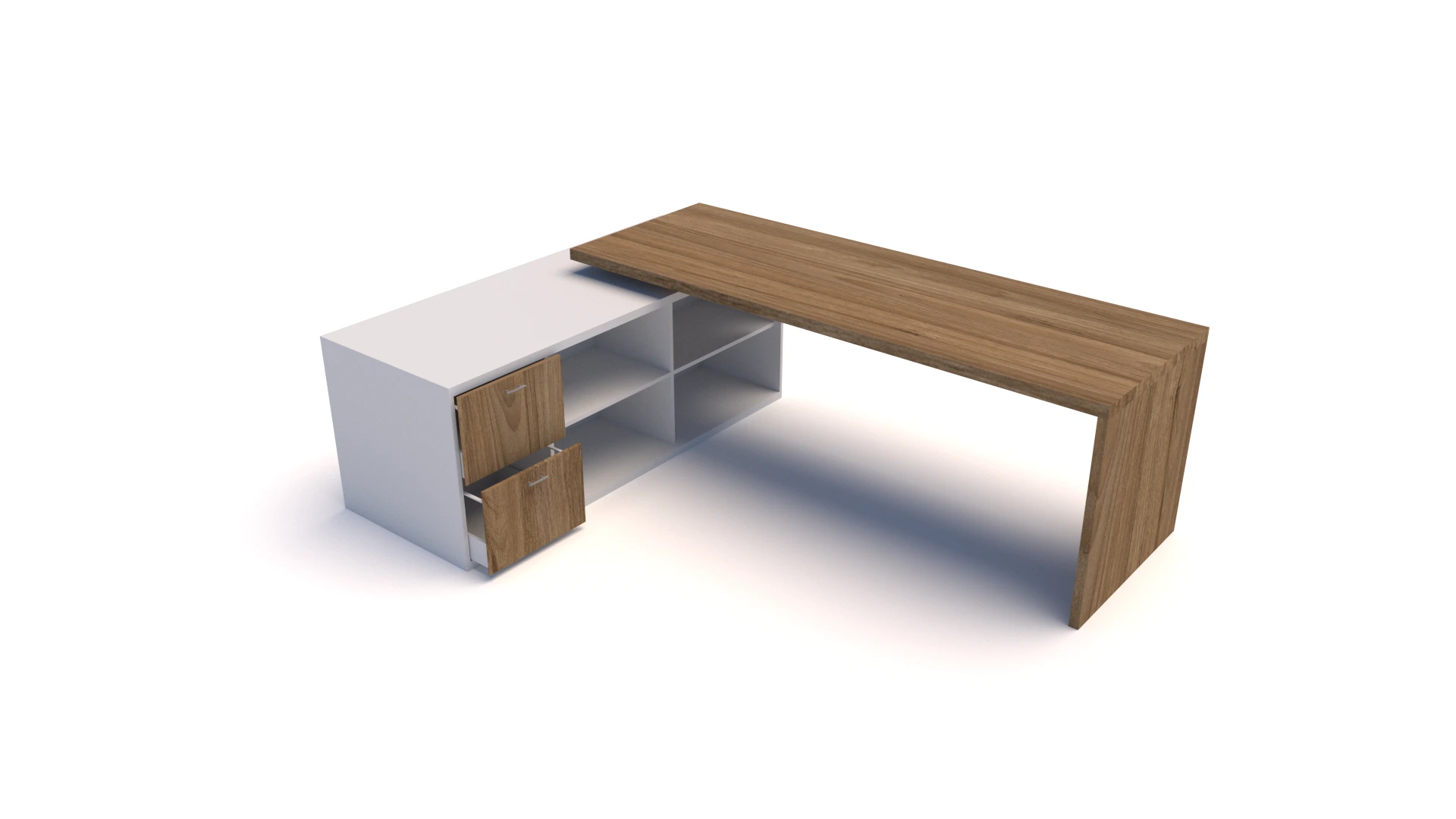 Escritorio gerencial en L (medidas a definir) fabricado en RH macizo de 30mm, pedestales entamborados, falda en tablex de 15mm , retorno tipo credenza de 15mm en RH con un servicio de 2 gavetas con chapa de seguridad, otro servicio con puerta batiente con chapa de seguridad y entrepaño medio. Los acabados y combinaciones de color se eligen a partir de la aprobación del proyecto.