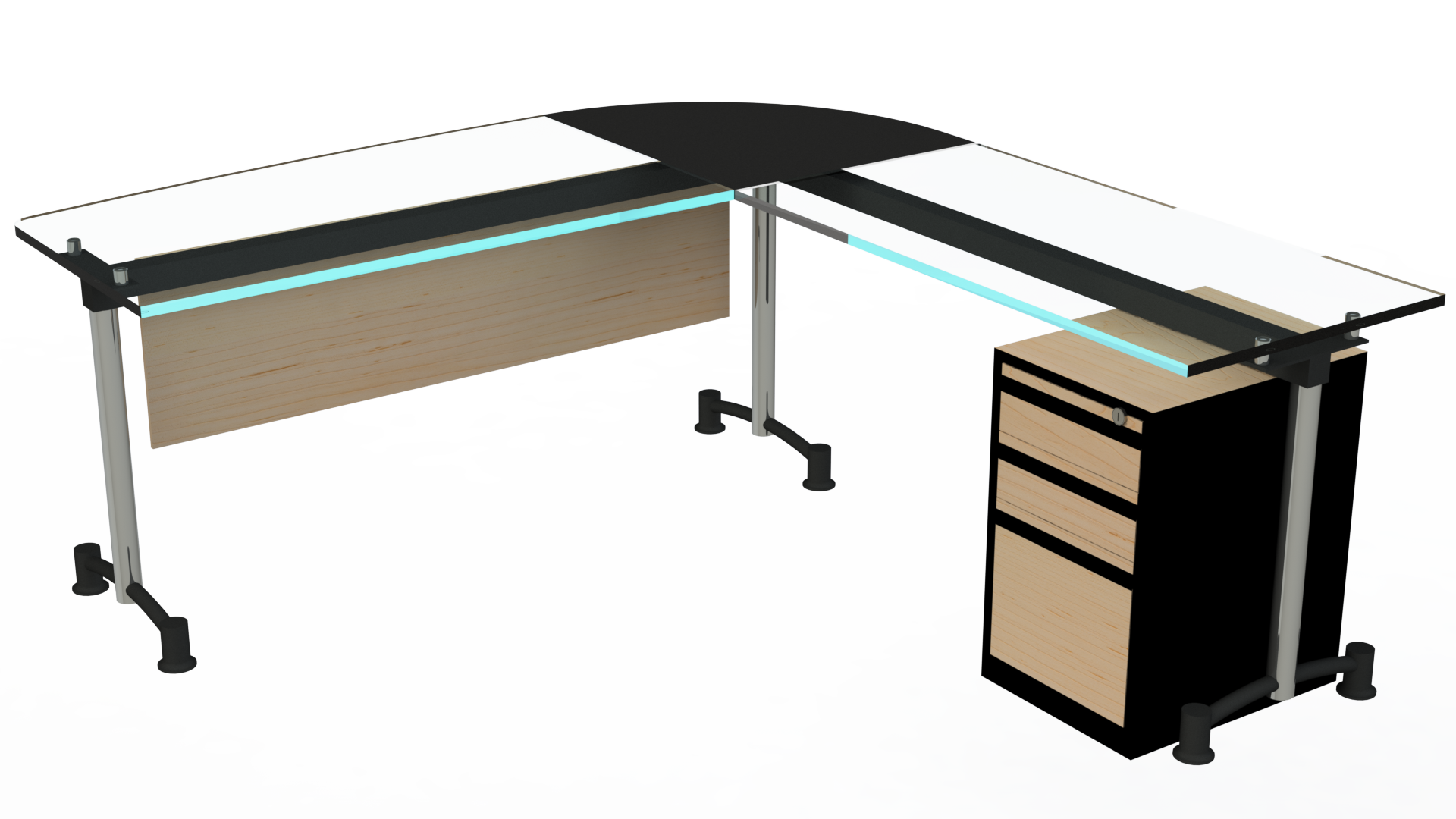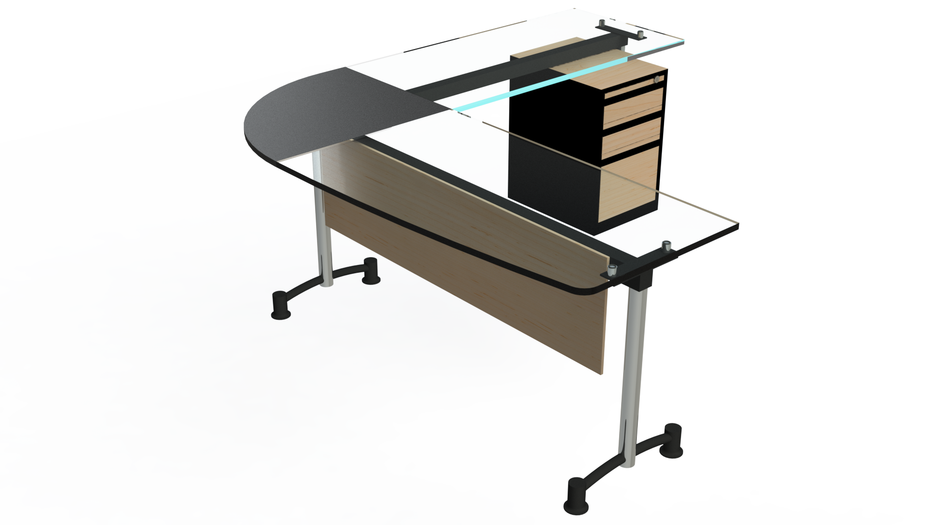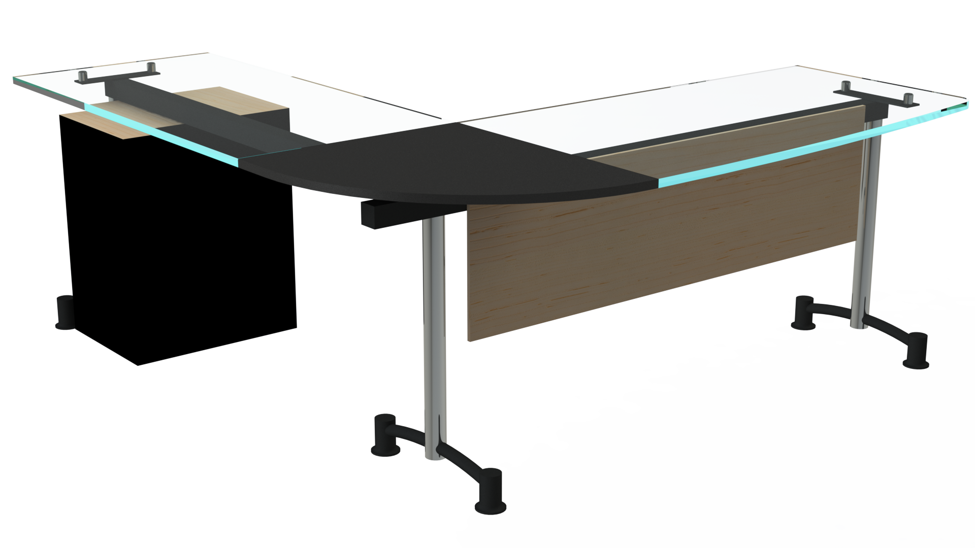 Superficie en vidrio templado de 10 mm, o en tablee enchapado en formica F8 en colores planos o texturizados. Estructura metálica con acabados en pintura electrostática, herraje pata cromada. Archivador 2×1 mini con frentes en tablex de 15mm, enchapado en fórmica F8 en colores planos o texturizados, o metálico completamente.