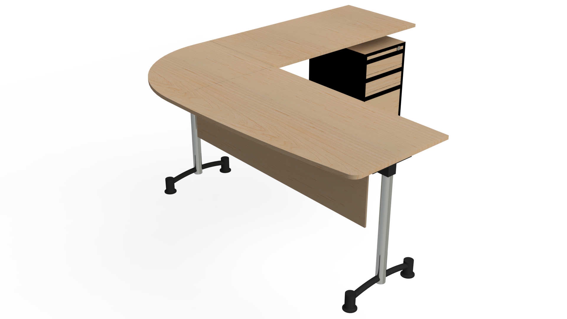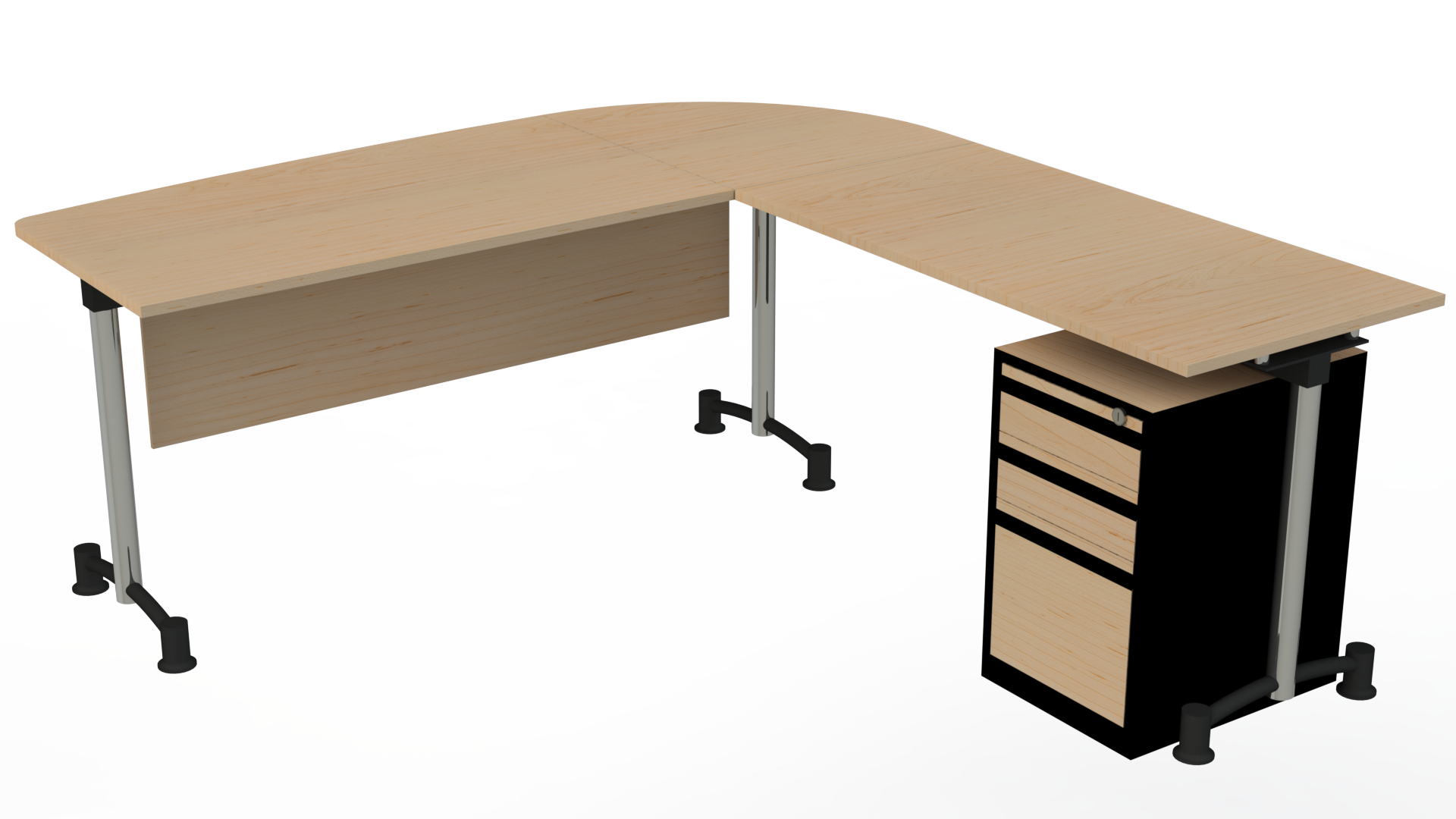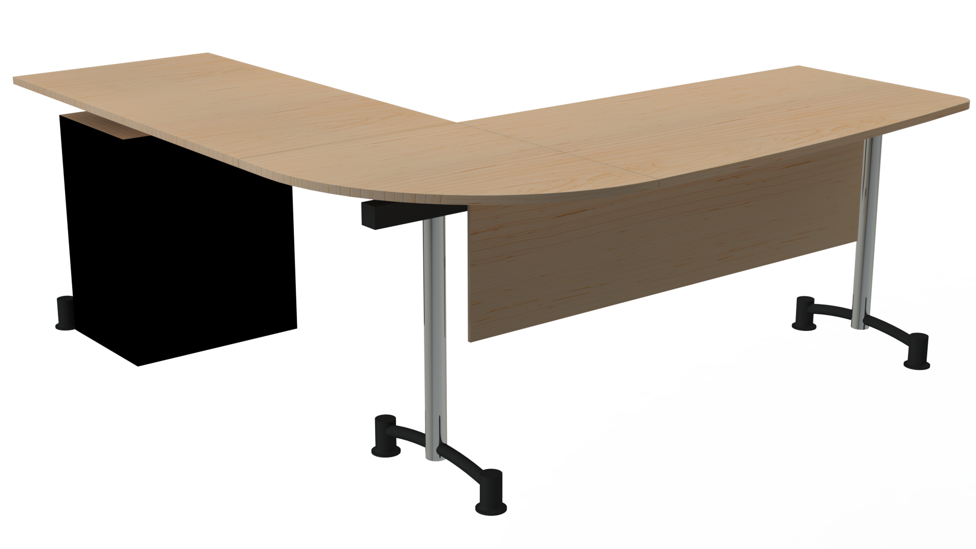 Superficie en vidrio templado de 10 mm, o en tablee enchapado en formica F8 en colores planos o texturizados. Estructura metálica con acabados en pintura electrostática, herraje pata cromada. Archivador 2×1 mini con frentes en tablex de 15mm, enchapado en fórmica F8 en colores planos o texturizados, o metálico completamente.