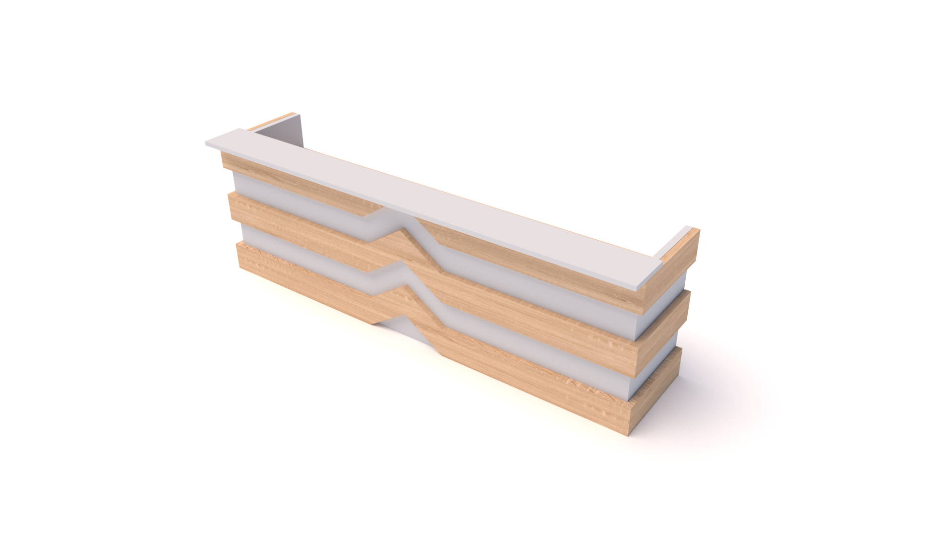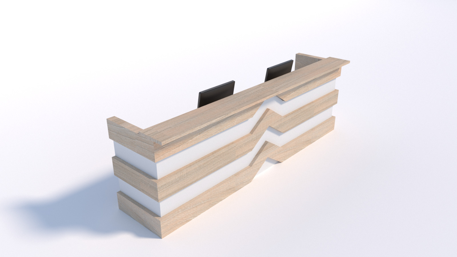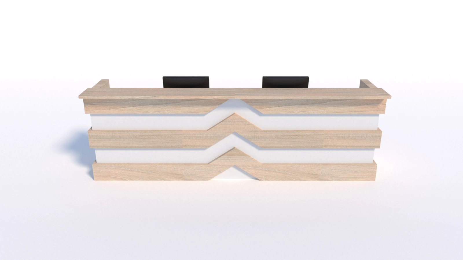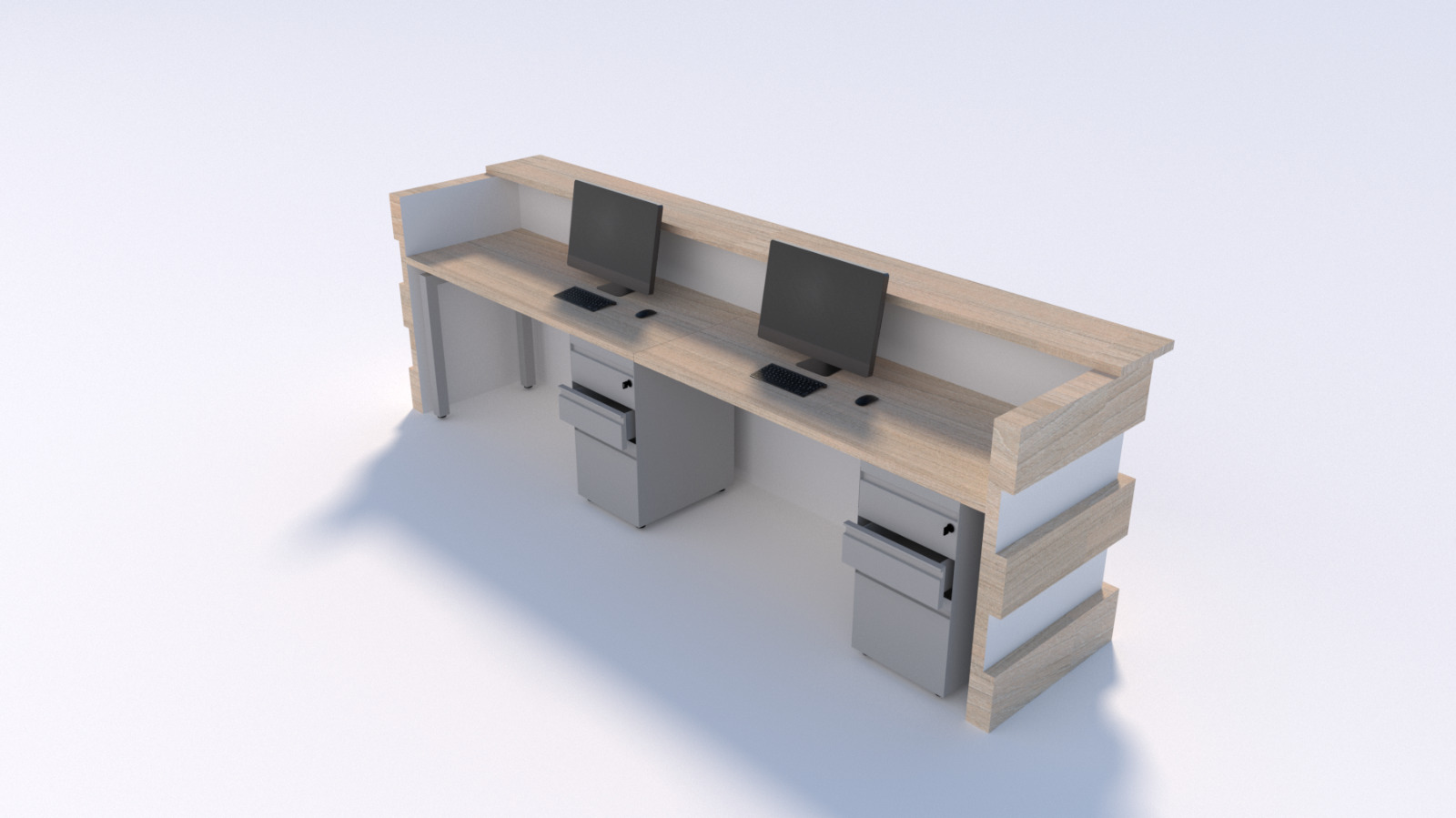 Recepción recta (medidas a definir) con diseño especial intercalado simulando bloques uno encima de otro, profundidad de 0.60, superficie en tablex de 30 mm enchapadas en formicas, frente entamborado en tablex de 50 mm enchapado en formica en un lateral, mostrador en tablex de 30mm, Archivador 2×1 metálico, tapa pasacable y canaleta metálica para cableado. Los acabados y combinaciones de color se eligen a partir de la aprobación del proyecto.