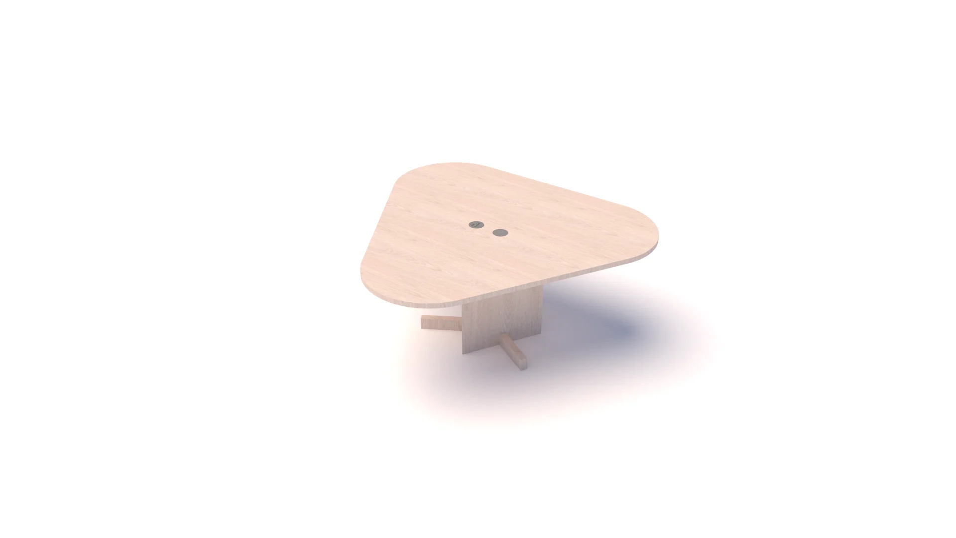 Mesa de juntas con tres puntas curvas con superficie en RH macizo de 30mm patas entamboradas de 8cm de espesor. Grommet especial con porta toma. No incluye cableado electrico. Los acabados y combinaciones de color se eligen a partir de la aprobación del proyecto.